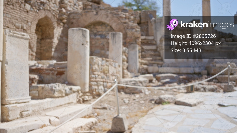 Ancient stone ruins and weathered marble columns lining a sunlit path, softly blurred outdoor background; background backdrop copyspace calm.