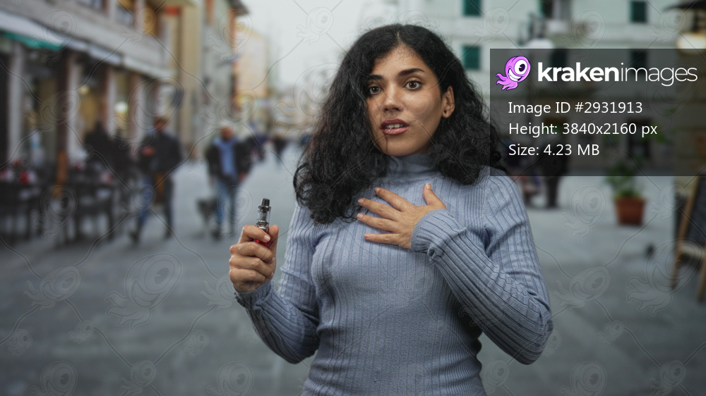 Arab woman holding vape device with one hand and palm pressed to chest in a busy street scene; surprise apology.