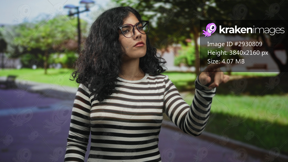 Arab woman raising both hands on street beside green park trees, wearing striped shirt and glasses; confidence.