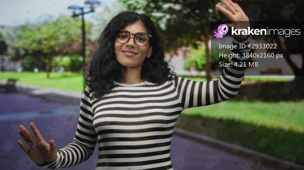 Arab woman raising both hands on street beside green park trees, wearing striped shirt and glasses; confidence.