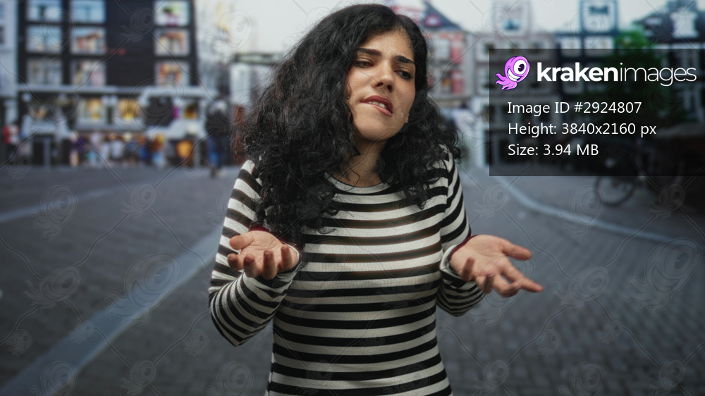 Arab woman shrugs with open hands on a cobblestone city street plaza framed by canal houses and bicycles; confusion uncertainty.