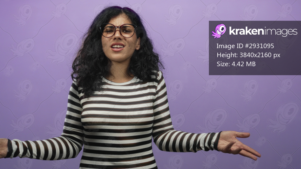 Arab woman wearing glasses and striped top gesturing with hands in studio against a purple backdrop; frustration expression.