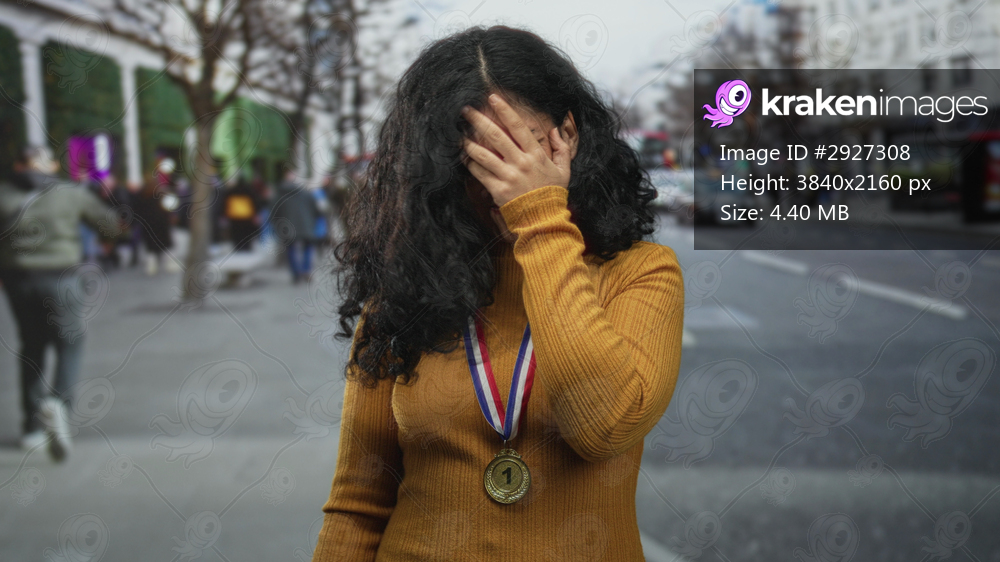 Arab woman wearing gold medal covers face with hand on city street; embarrassment doubt resilience exposure.