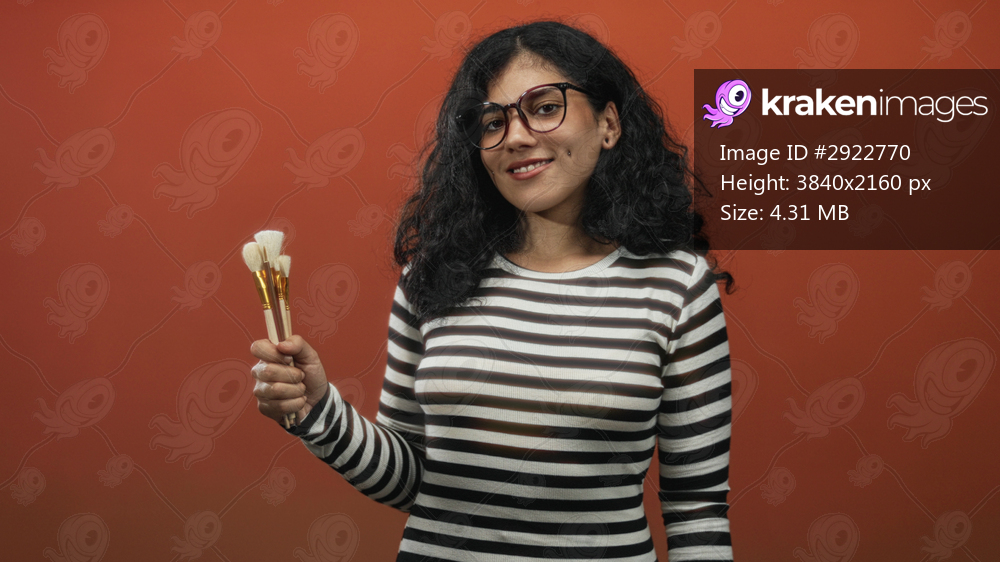 Arab woman, young brunette wearing glasses and striped top, holding makeup brushes and presenting them in an orange studio setting; creative confidence. - Kraken Images