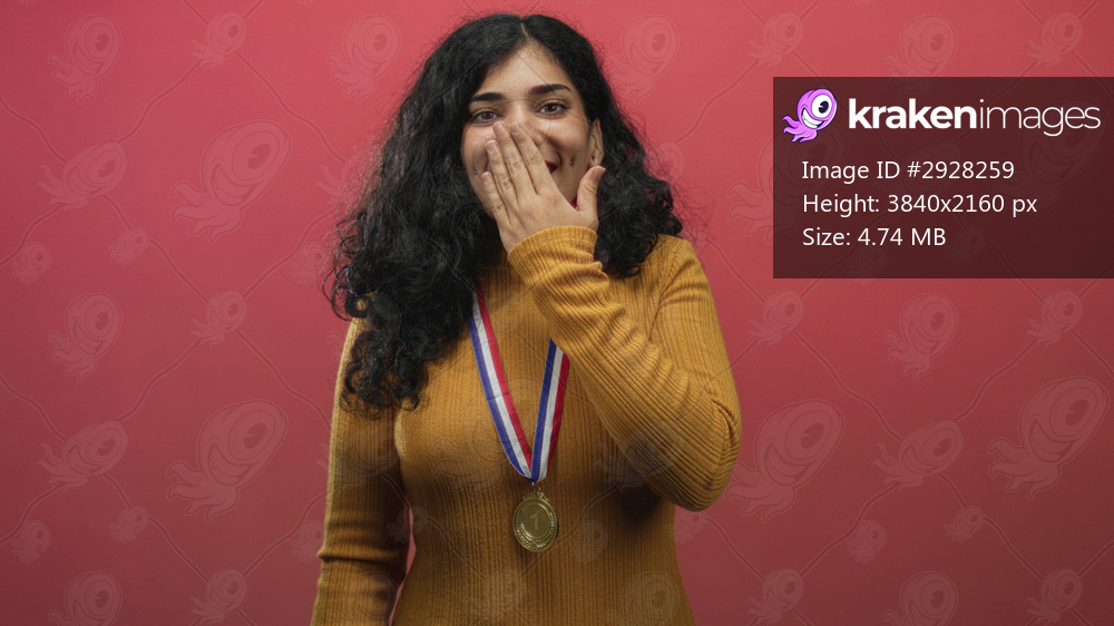 Arab young brunette woman wearing a gold medal and mustard sweater covers mouth with hand in red studio; surprise victory moment.
