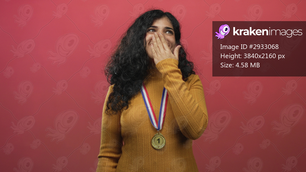 Arab young brunette woman wearing a gold medal and mustard sweater covers mouth with hand in red studio; surprise victory moment.