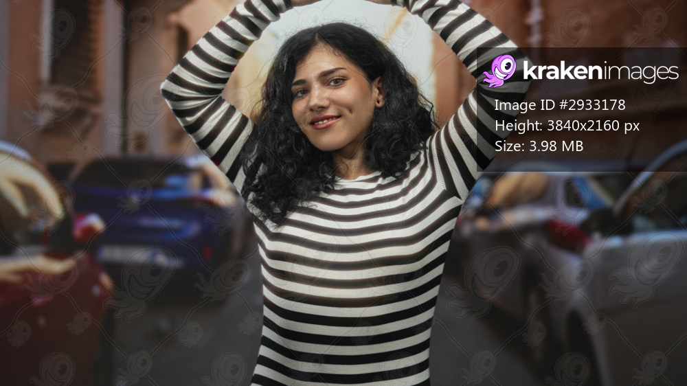 Arab young woman raising arms on busy city street in striped top, smiling with dimple; confidence empowerment expression.