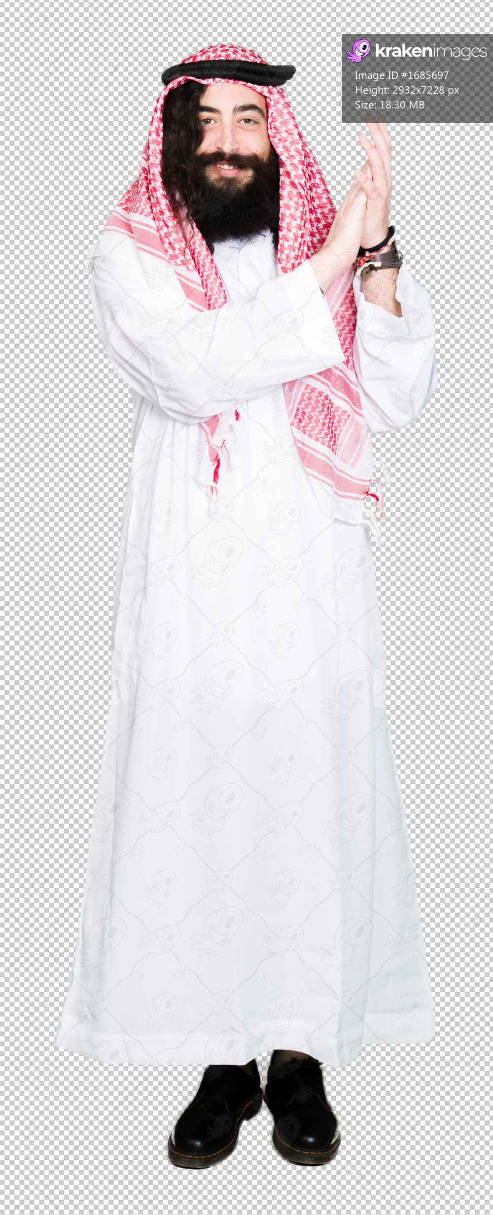 Arabian business man with long hair wearing traditional keffiyeh scarf Clapping and applauding happy and joyful, smiling proud hands together