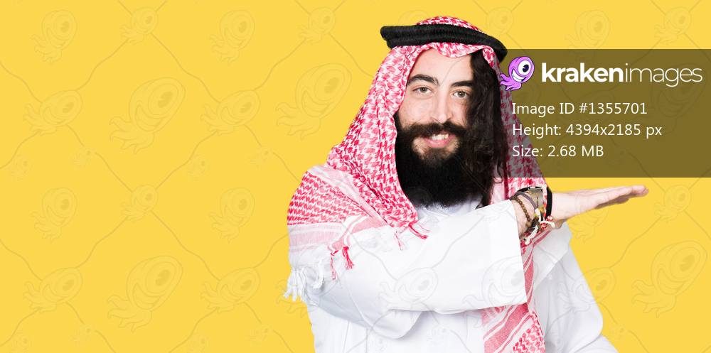 Arabian business man with long hair wearing traditional keffiyeh scarf gesturing with hands showing big and large size sign, measure symbol. Smiling looking at the camera. Measuring concept. - Kraken Images