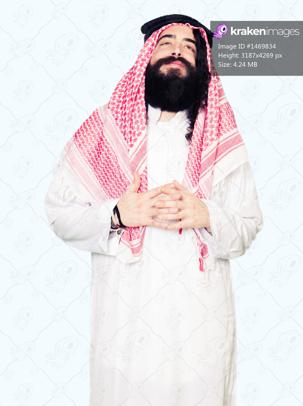 Arabian business man with long hair wearing traditional keffiyeh scarf Hands together and fingers crossed smiling relaxed and cheerful. Success and optimistic - Kraken Images