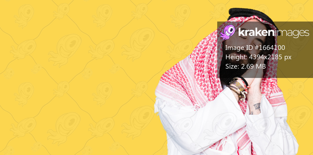 Arabian business man with long hair wearing traditional keffiyeh scarf sleeping tired dreaming and posing with hands together while smiling with closed eyes. - Kraken Images