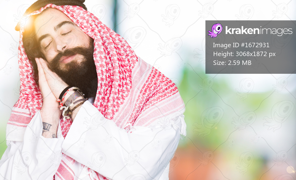 Arabian business man with long hair wearing traditional keffiyeh scarf sleeping tired dreaming and posing with hands together while smiling with closed eyes. - Kraken Images