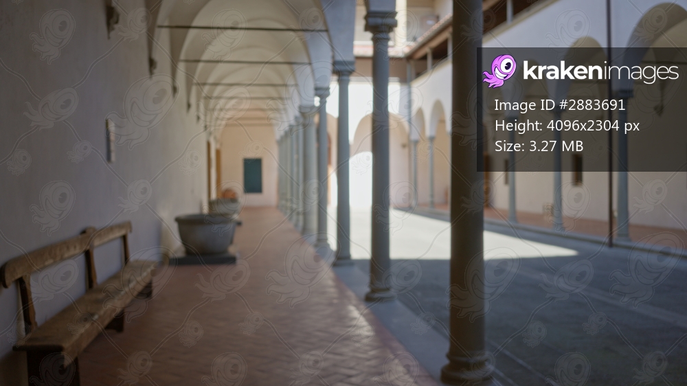 Arched cloister corridor with columned arcade, terracotta floor and bench, softly blurred shallow focus; background backdrop copyspace calm.