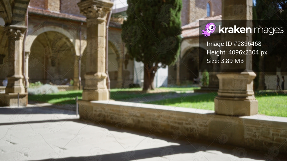 Arched cloister courtyard with stone columns, tiled roofs and grassy central garden, softly defocused shallow background church; background backplate calm.