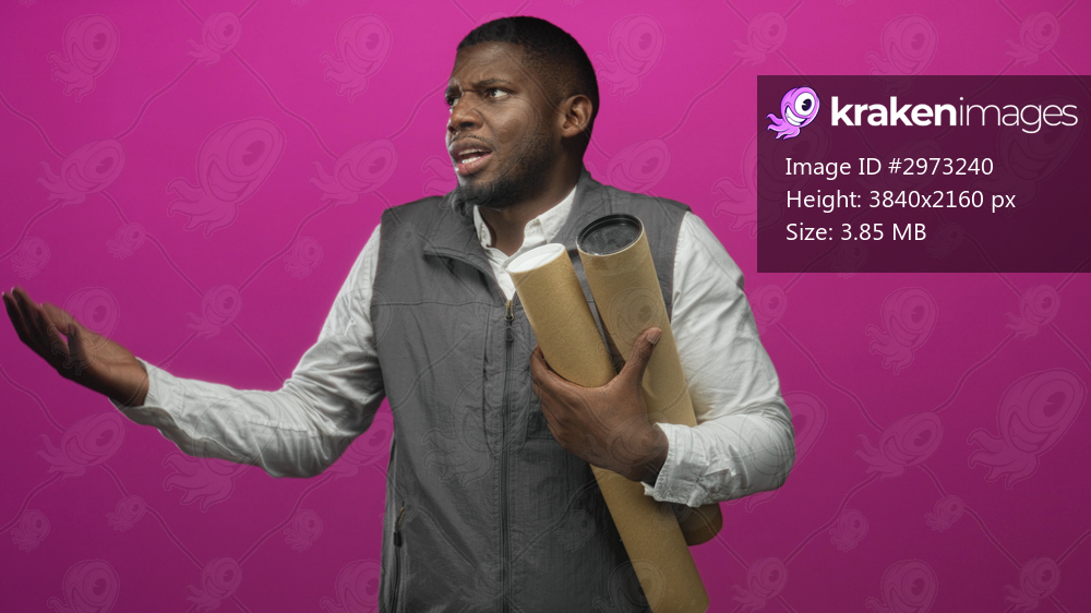 Architect man holding rolled blueprints, palm up questioning gesture in studio; uncertainty problem solving.