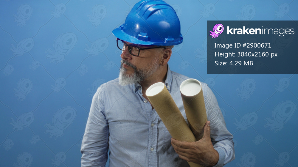 Architect man holding two rolled blueprint tubes and wearing a blue hardhat in studio; professional determination.