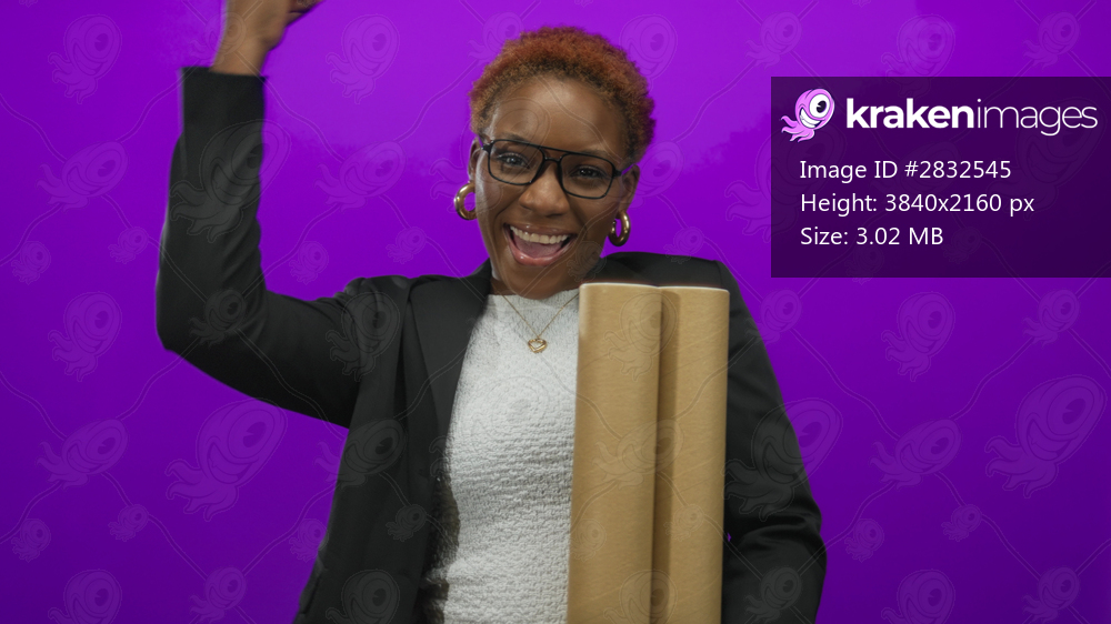 Architect woman holding two rolled blueprints pumps fist smiling while standing in purple studio; pride.