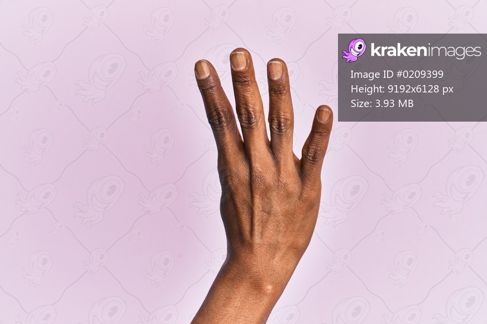 Arm and hand of black middle age woman over pink isolated background counting number 4 showing four fingers