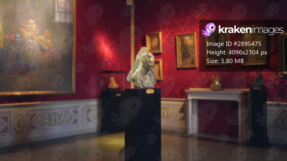 Art gallery softly blurred with bokeh on sculptures and framed paintings, museum background; background backdrop copyspace.