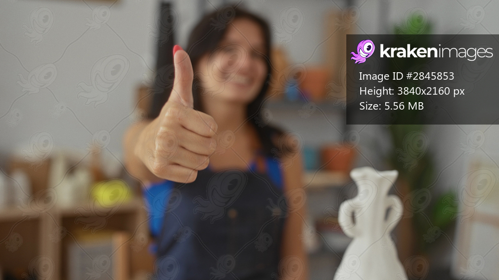 Artisan woman holds clay vase in one hand and shows thumb up with other hand in studio filled with pottery shelves; confidence creativity.