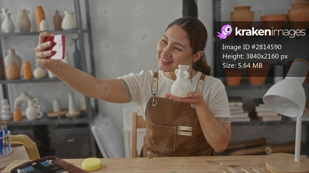 Artisan woman holds white vase and takes selfie with smartphone in studio while smiling; creativity joy.