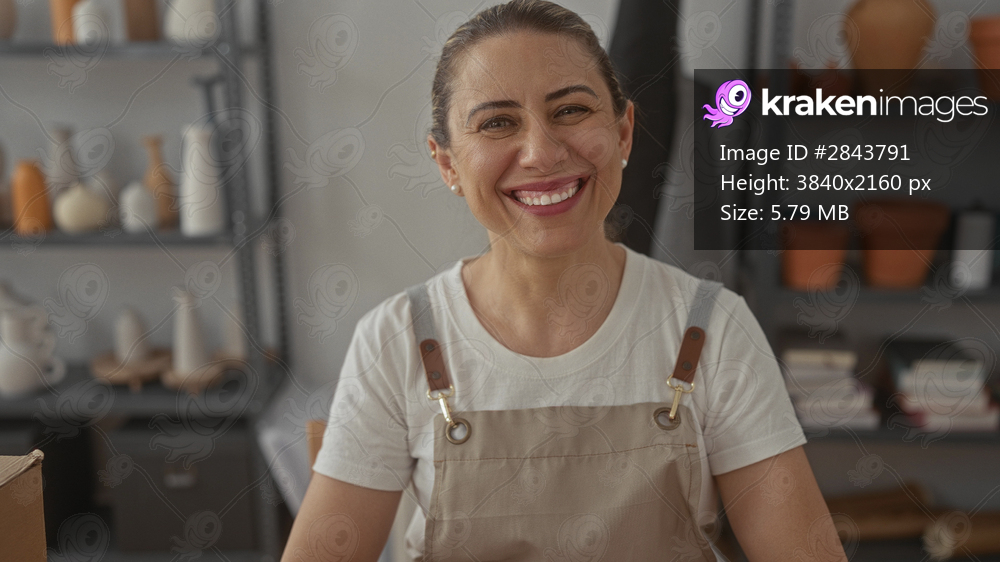 Artisan woman wearing apron smiles showing teeth beside ceramic pots and pottery shelves in studio workspace; joy.