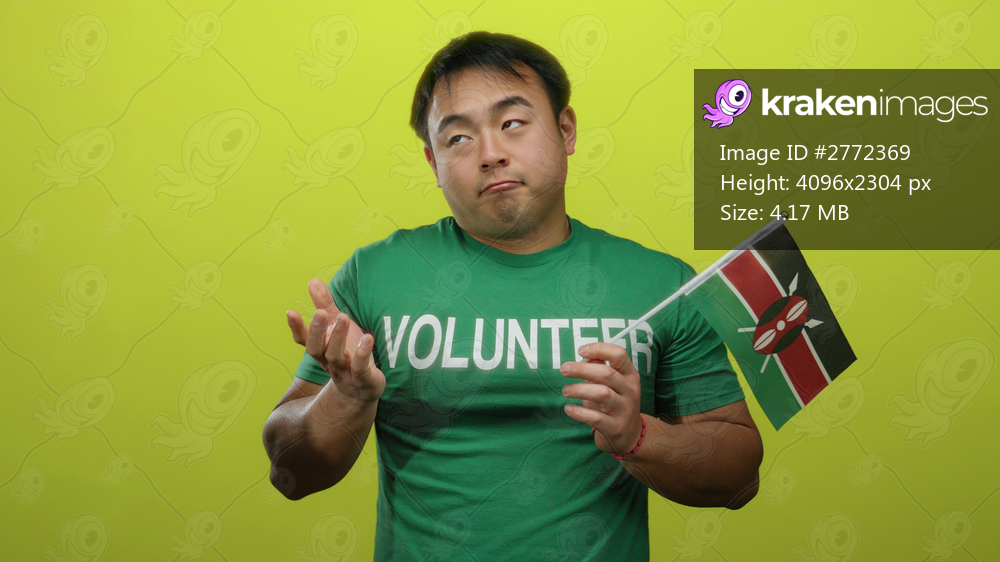 Asian man holding kenyan flag while wearing volunteer shirt, standing against vibrant yellow background, expressing confusion and uncertainty in isolated frame. - Kraken Images