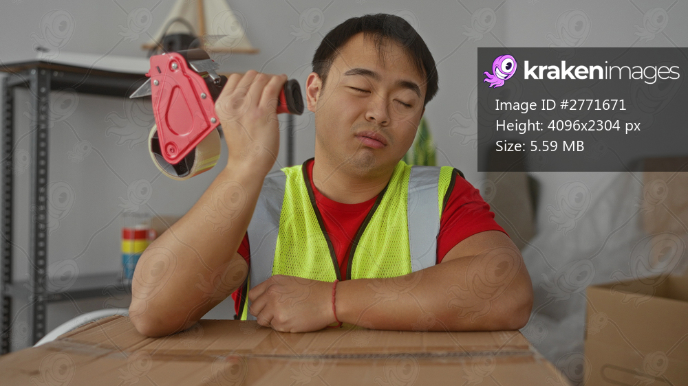 Asian man in a new home with packing supplies, wearing safety gear, suggesting moving process in an apartment setting.