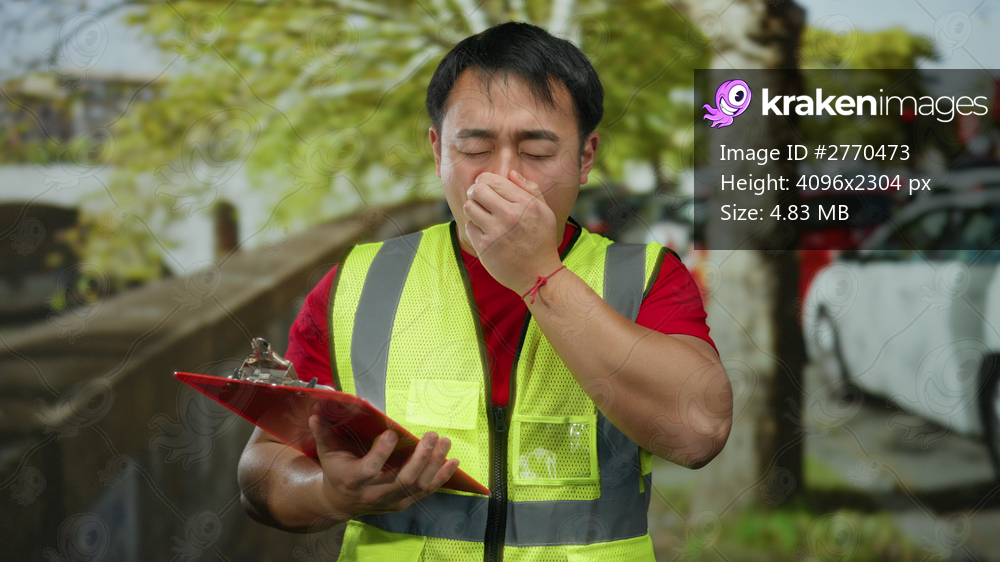 Asian man in a reflective vest holds a clipboard on a busy city street, sneezing with eyes closed, surrounded by urban traffic and greenery, illustrating a real-world outdoor scenario. - Kraken Images