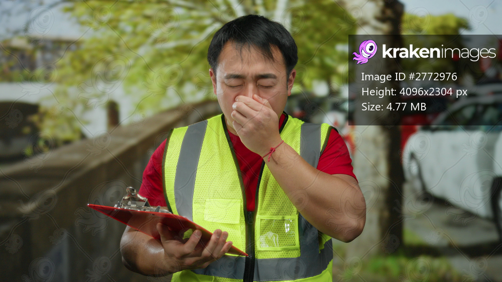 Asian man in a reflective vest holds a clipboard on a busy city street, sneezing with eyes closed, surrounded by urban traffic and greenery, illustrating a real-world outdoor scenario. - Kraken Images