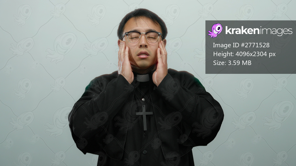 Asian man in priest attire holding head in distress against plain background, conveying emotion and religious theme.