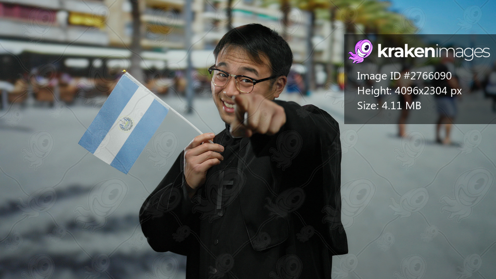 Asian man priest smiling holding salvadoran flag on busy urban street with buildings and people in background.
