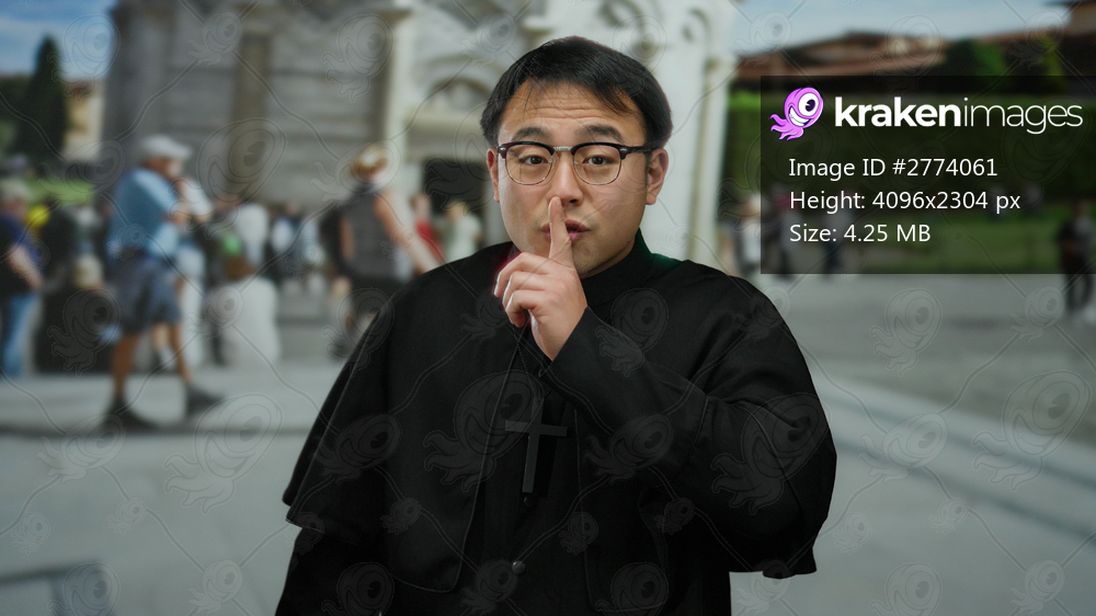 Asian priest dressed in black with glasses standing outdoors in a busy urban street setting, surrounded by blurred people, invoking a serene city atmosphere. - Kraken Images