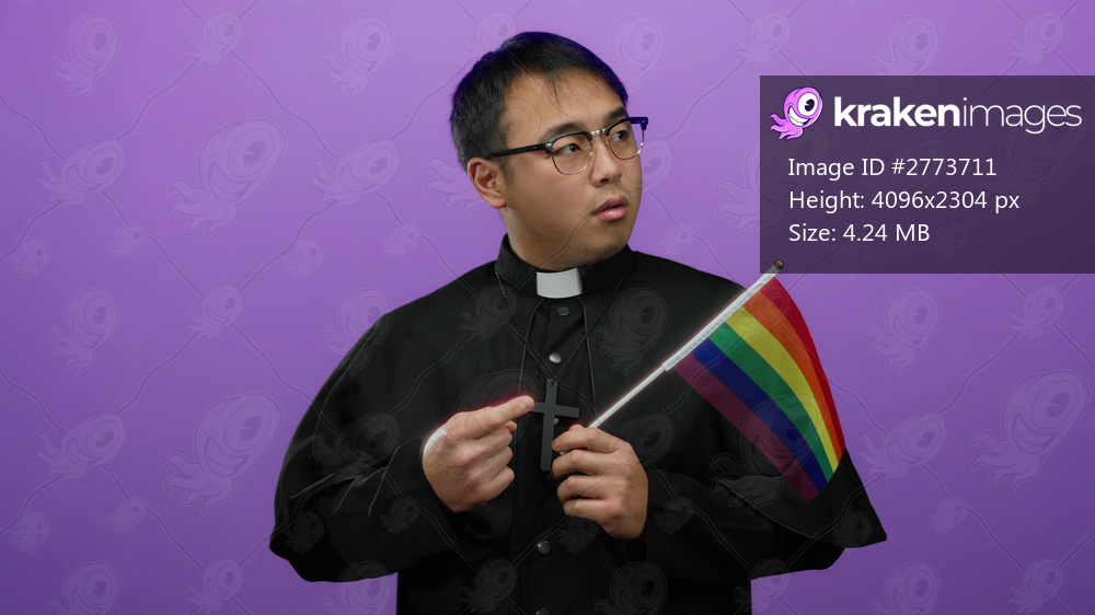Asian priest holding a rainbow flag gestures with surprise against a vibrant purple background, symbolizing lgbt support.