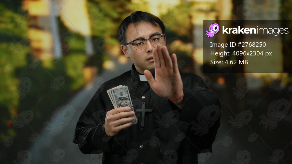 Asian priest holding money on a city street, wearing glasses and black robe, expressing denial with hand gesture, representing religion and finance themes. - Kraken Images