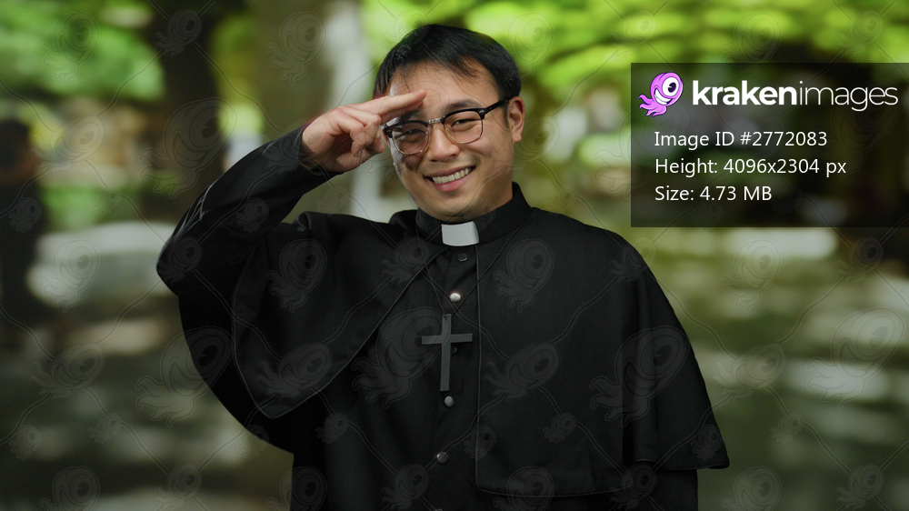 Asian priest in black robe smiling outdoors in sunny park with green trees.