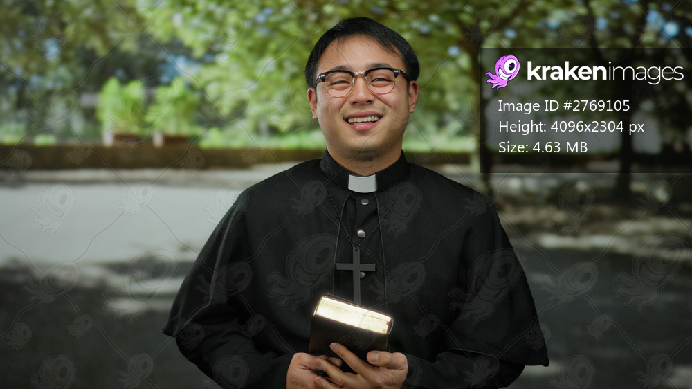 Asian priest smiling in park while holding bible, wearing black clerical attire under shade of trees, conveying joy, spirituality, and faith outdoors.