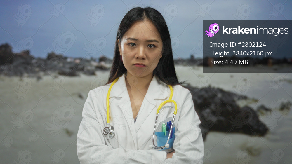 Asian woman doctor in uniform with stethoscope stands on a scenic seaside beach, showcasing a blend of professional and serene outdoor environment.