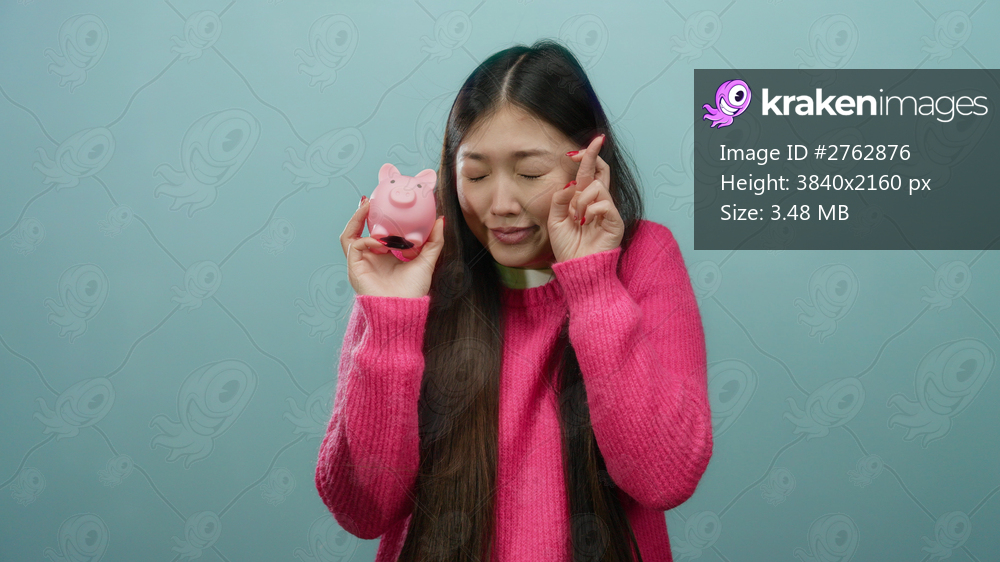 Asian woman holding piggy bank with crossed fingers in hope against blue background, wearing a pink sweater and expressing financial optimism.