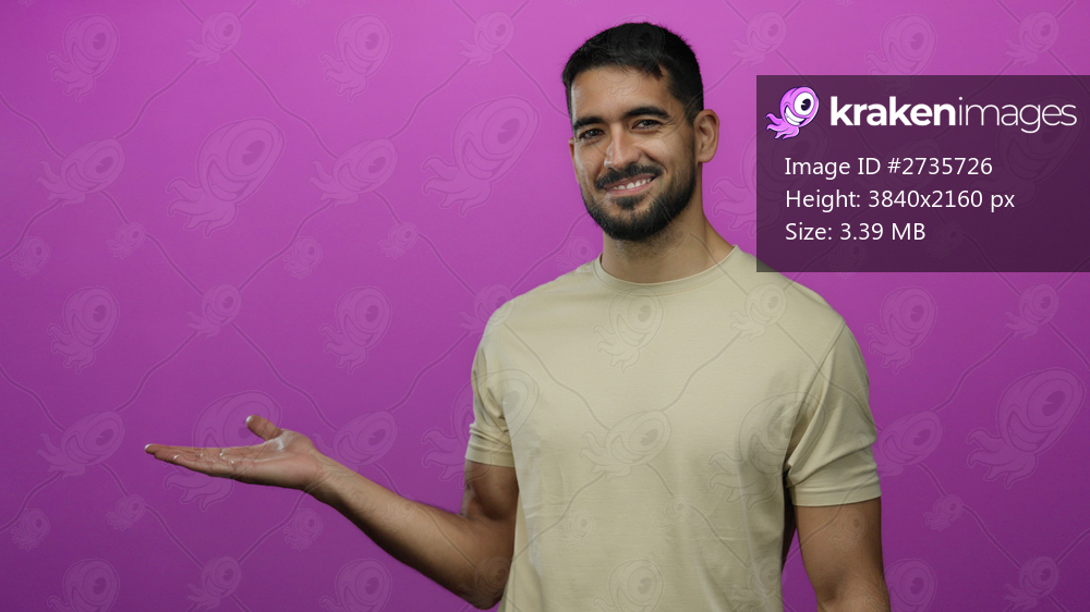 Attractive man gesturing with open hand over pink background smiling confidently and wearing beige shirt