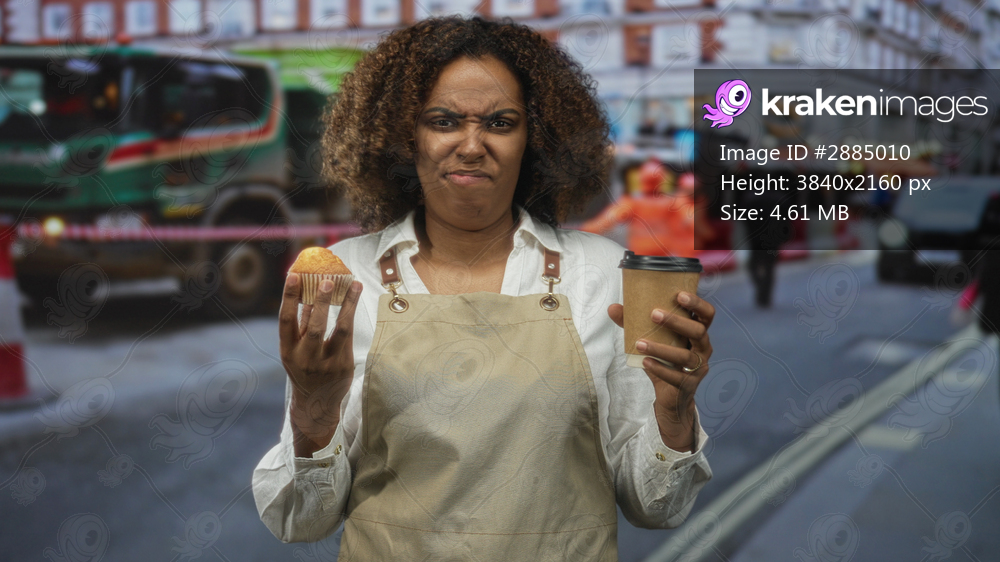 Baker woman in apron holds a muffin and a paper coffee cup and grimaces on a street beside construction vehicles; workday inconvenience disgust.