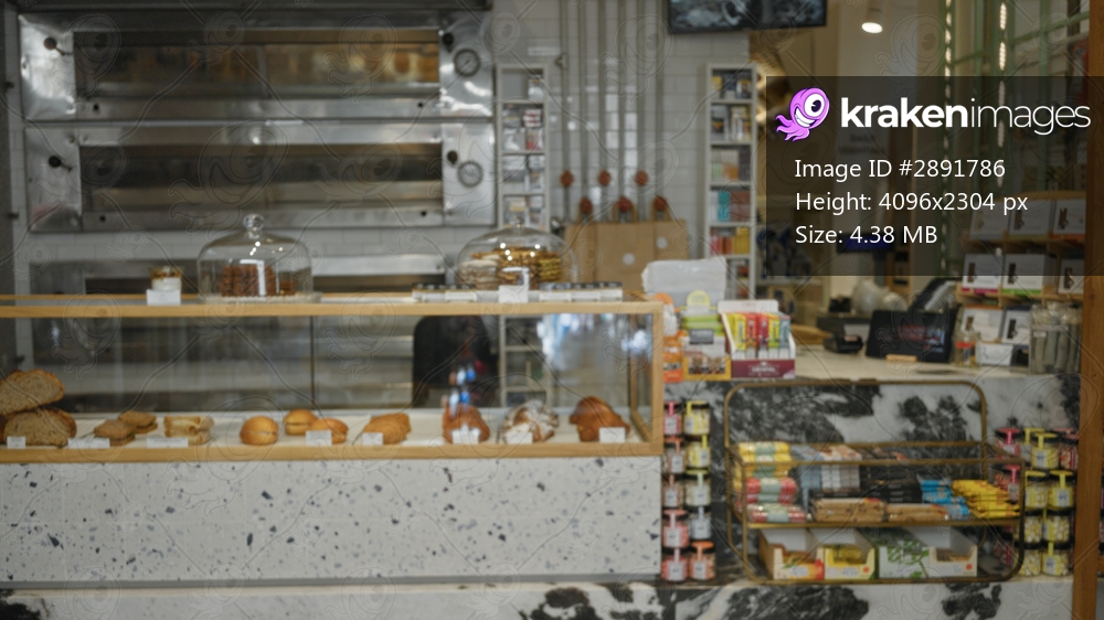 Bakery counter interior with defocused shallow bokeh and warm lighting, shop; background backdrop copyspace calm.