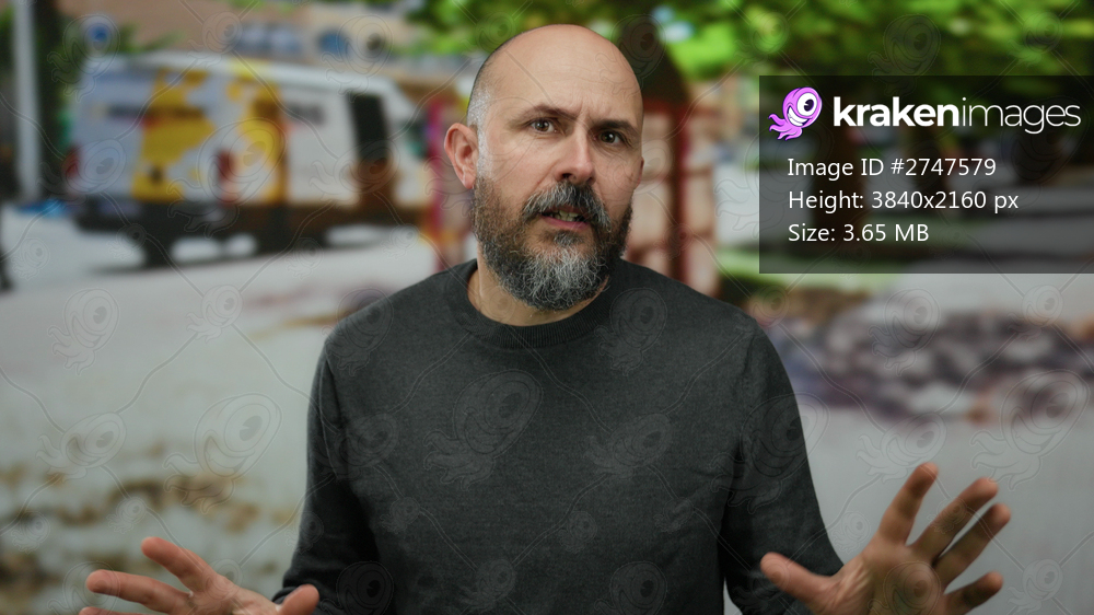 Bald bearded man gesturing outdoors on city street with vehicles and trees in background.