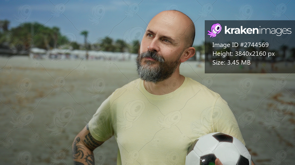 Bald bearded man holding soccer ball on sunny beach surrounded by palm trees under blue sky enjoying outdoor scenery.