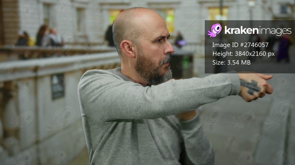 Bald bearded man mimics pulling an invisible rope on a city street, showcasing playful behavior in an urban outdoor environment.