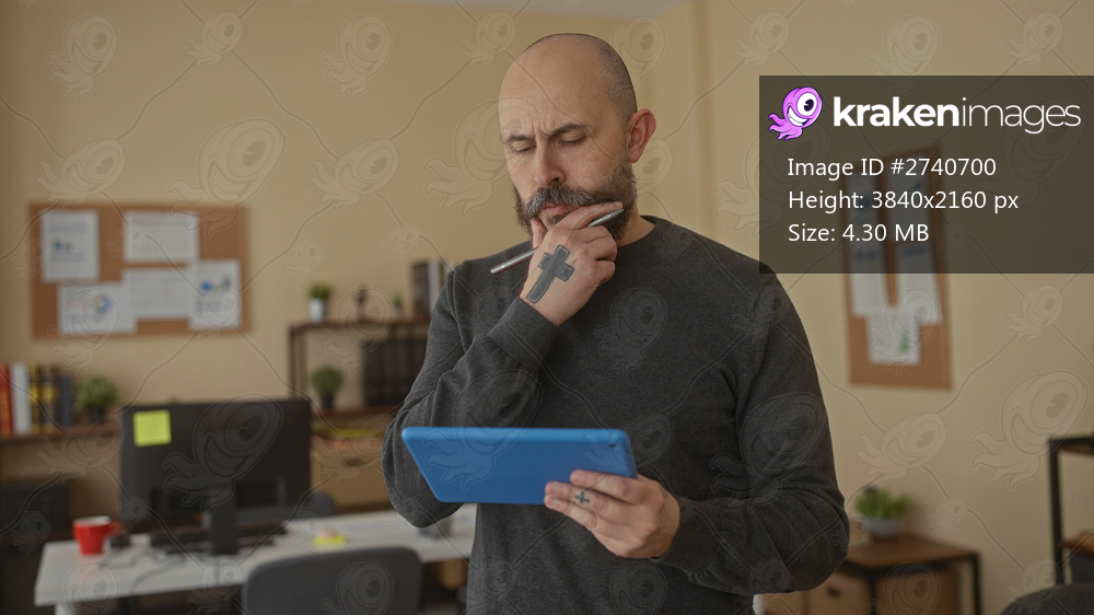 Bald bearded man using tablet in office with modern decor including computer desk plants and shelves.