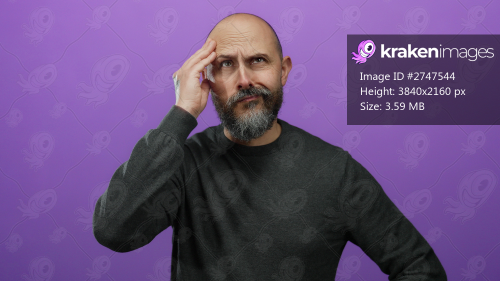 Bald man with a beard in a gray sweater looks puzzled with a hand on his forehead against an isolated purple background.
