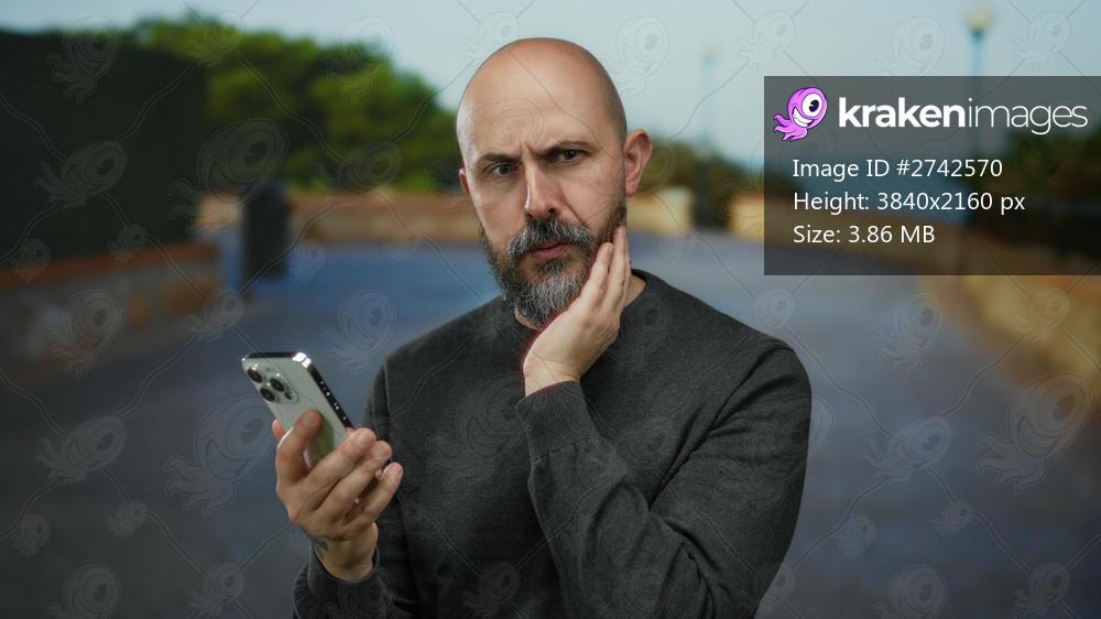 Bald man with a beard looks thoughtful while holding a smartphone on a sunny promenade by the seaside with trees and beach visible in the outdoor background. - Kraken Images