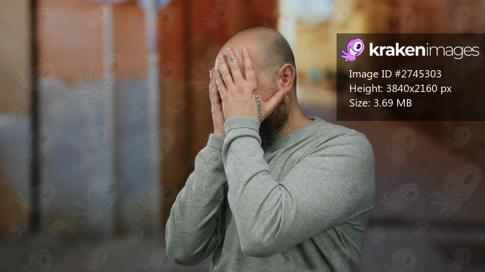 Bald man with beard appears distressed on urban street, hands on face, wearing gray sweater in outdoor city setting.