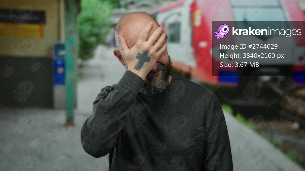 Bald man with beard at outdoor train station showing distress while standing near railway with colorful train in background.